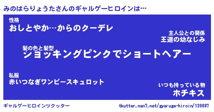 | 女子向けラノベタイトル風あだ名 | 『(仮)みのはらりょうたのやんごとなき事情』 |