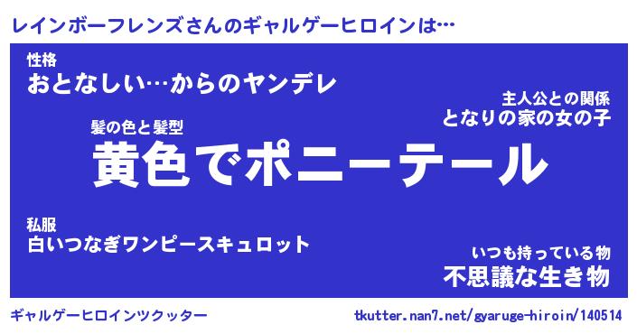 | 女子向けラノベタイトル風あだ名 | 『誰かこのレインボーフレンズを説明してください! ~契約から始まるウェディング~』 |