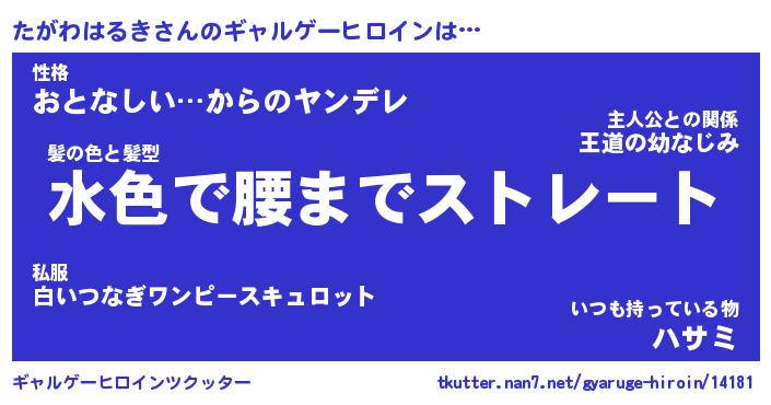 | 男性向けラノベタイトル風あだ名 | 『たがわはるきの憂鬱』 |