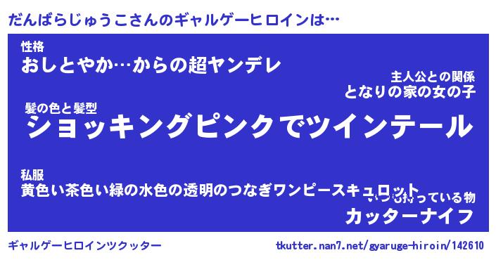| 女子向けラノベタイトル風あだ名 | 『(仮)だんばらじゅうこのやんごとなき事情』 |