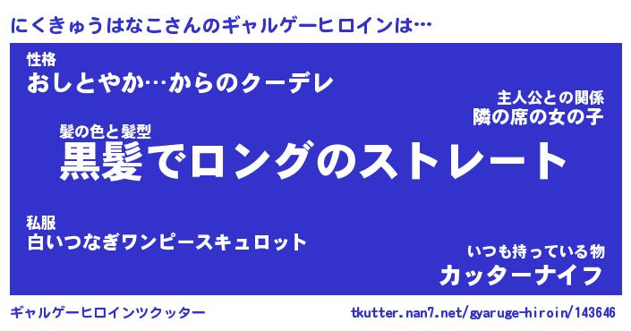 | 男性向けラノベタイトル風あだ名 | 『にくきゅうはなこの憂鬱』 |
