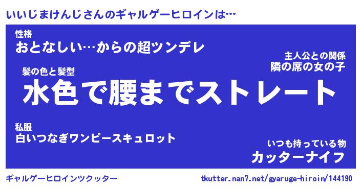 | 女子向けラノベタイトル風あだ名 | 『(仮)いいじまけんじのやんごとなき事情』 |