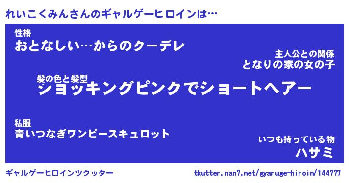 | 女子向けラノベタイトル風あだ名 | 『(仮)れいこくみんのやんごとなき事情』 |
