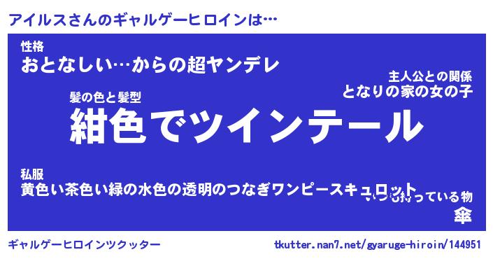 | 意味不明あだ名 | 『ペロリンアイルス』『永久保存アイルス』 |