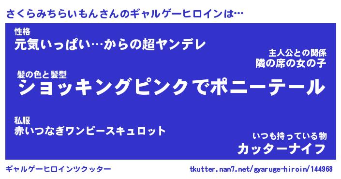 | 胡散臭い通販商品みたいなあだ名 | 『必ず成功するブレスレット…その名も「さくらみちらいもん」』 |
