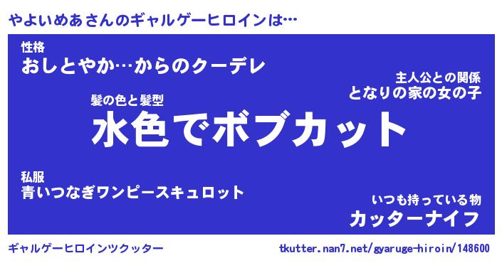 | 男性向けラノベタイトル風あだ名 | 『やよいめあの憂鬱』 |