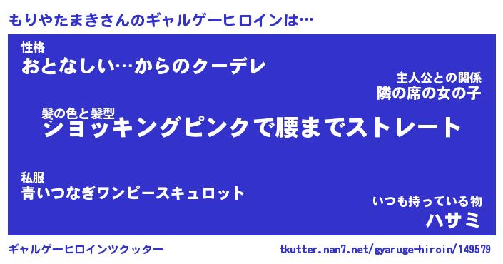 | 女子向けラノベタイトル風あだ名 | 『(仮)もりやたまきのやんごとなき事情』 |