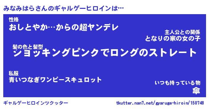 | 女子向けラノベタイトル風あだ名 | 『(仮)みなみはらのやんごとなき事情』 |