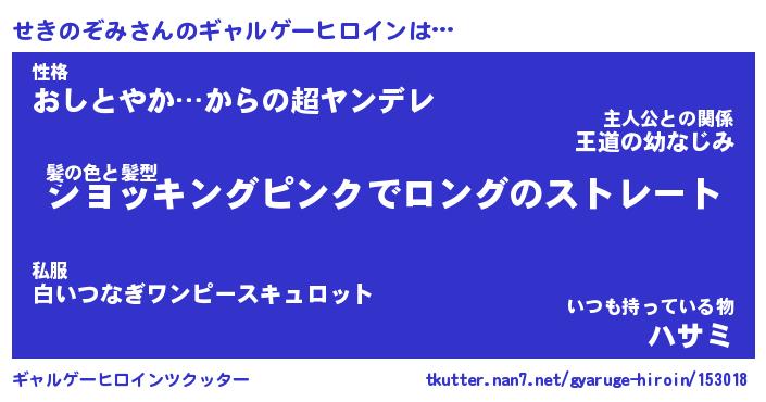 | 女子向けラノベタイトル風あだ名 | 『(仮)せきのぞみのやんごとなき事情』 |