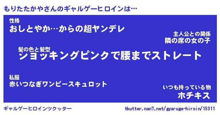 | 女子向けラノベタイトル風あだ名 | 『(仮)もりたたかやのやんごとなき事情』 |