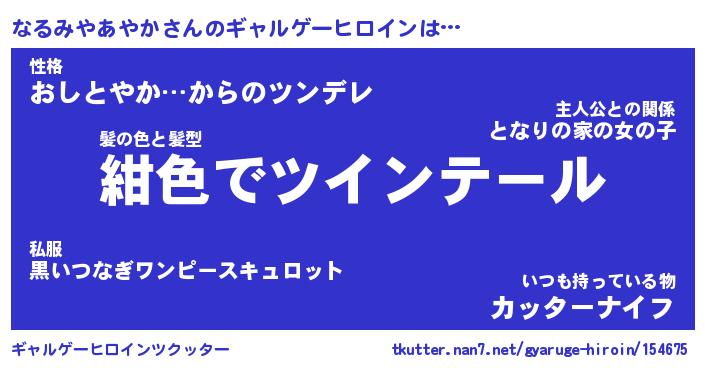| 男性向けラノベタイトル風あだ名 | 『ナルミヤアヤカアートオンライン』 |