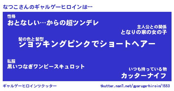 | 女子向けラノベタイトル風あだ名 | 『(仮)なつこのやんごとなき事情』 |