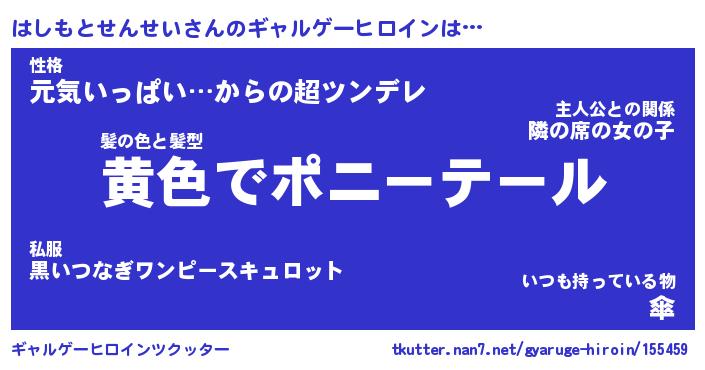 | 男性向けラノベタイトル風あだ名 | 『ハシモトセンセイアートオンライン』 |