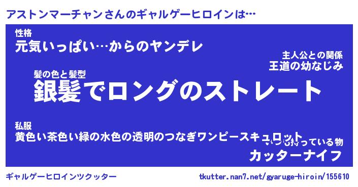 | 女子向けラノベタイトル風あだ名 | 『アストンマーチャン姫と円卓の騎士』 |