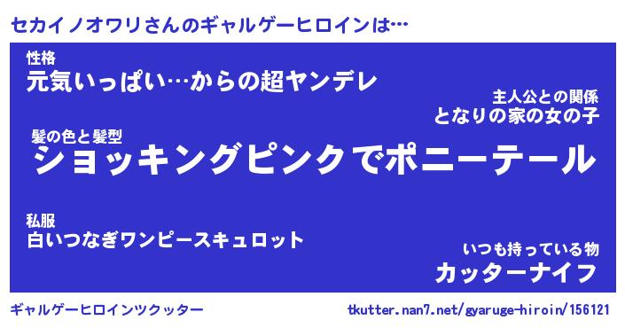 | 女子向けラノベタイトル風あだ名 | 『(仮)セカイノオワリのやんごとなき事情』 |