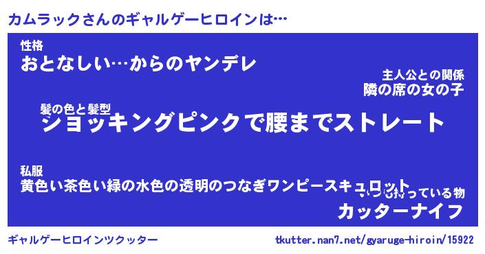 | 女子向けラノベタイトル風あだ名 | 『(仮)カムラックのやんごとなき事情』 |