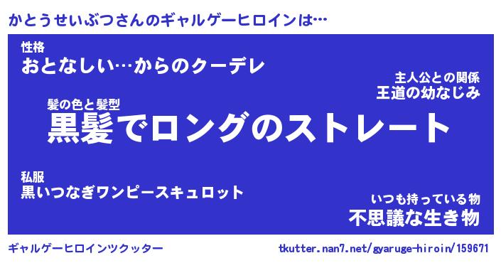 | 女子向けラノベタイトル風あだ名 | 『(仮)かとうせいぶつのやんごとなき事情』 |