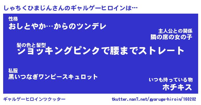 | 女子向けラノベタイトル風あだ名 | 『(仮)しゃちくひまじんのやんごとなき事情』 |