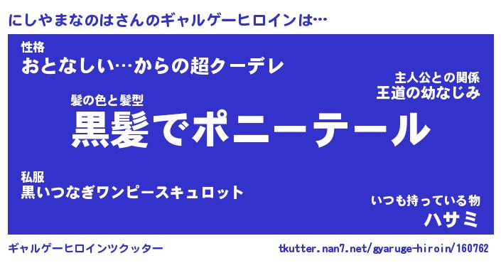 | 女子向けラノベタイトル風あだ名 | 『(仮)にしやまなのはのやんごとなき事情』 |