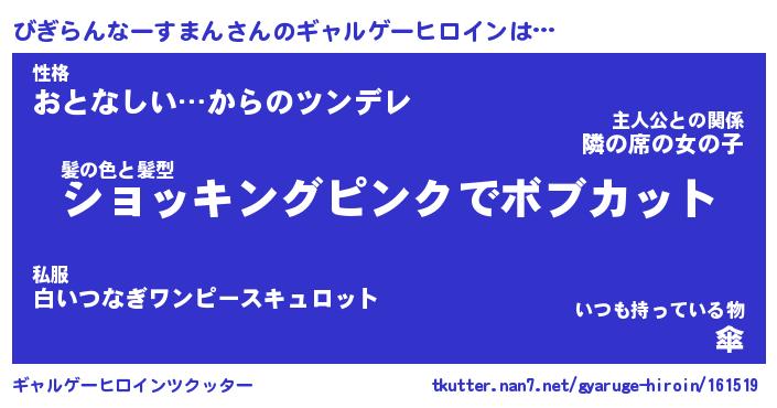 | 女子向けラノベタイトル風あだ名 | 『(仮)びぎらんなーすまんのやんごとなき事情』 |