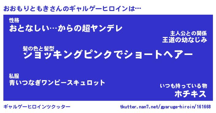 | 女子向けラノベタイトル風あだ名 | 『(仮)おおもりともきのやんごとなき事情』 |