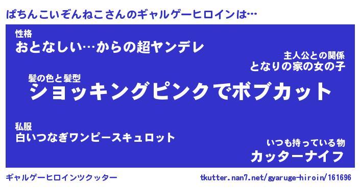 | 女子向けラノベタイトル風あだ名 | 『(仮)ぱちんこいぞんねこのやんごとなき事情』 |