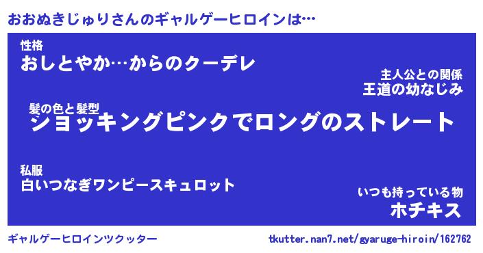 | 女子向けラノベタイトル風あだ名 | 『(仮)おおぬきじゅりのやんごとなき事情』 |