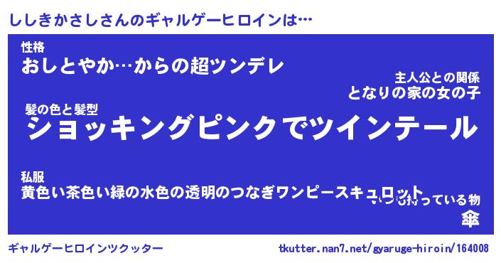 | 女子向けラノベタイトル風あだ名 | 『(仮)ししきかさしのやんごとなき事情』 |