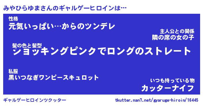 | 女子向けラノベタイトル風あだ名 | 『(仮)みやひらゆまのやんごとなき事情』 |