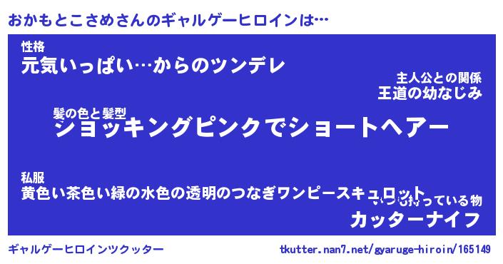 | 女子向けラノベタイトル風あだ名 | 『(仮)おかもとこさめのやんごとなき事情』 |