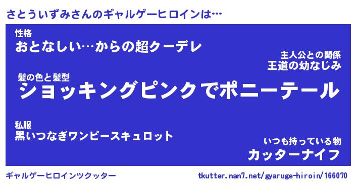 | 女子向けラノベタイトル風あだ名 | 『(仮)さとういずみのやんごとなき事情』 |