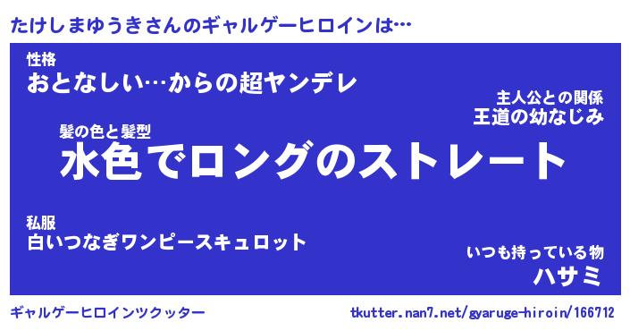 | 男性向けラノベタイトル風あだ名 | 『たけしまゆうきの憂鬱』 |