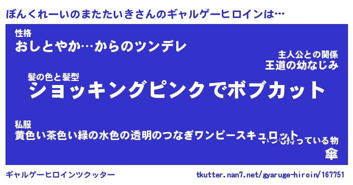 | 女子向けラノベタイトル風あだ名 | 『(仮)ぼんくれーいのまたたいきのやんごとなき事情』 |
