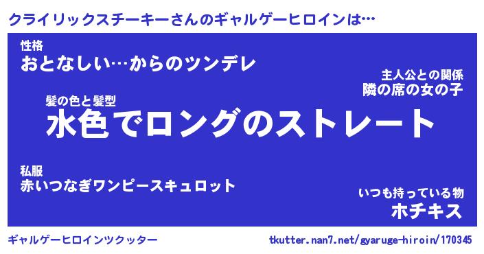 | 男性向けラノベタイトル風あだ名 | 『クライリックスチーキーの憂鬱』 |