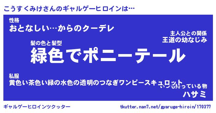 | 女子向けラノベタイトル風あだ名 | 『こうすくみけ姫と円卓の騎士』 |