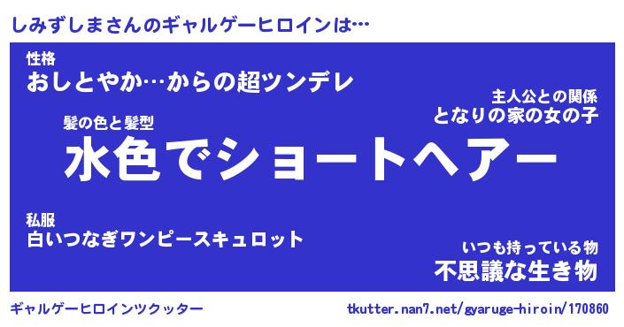 | 男性向けラノベタイトル風あだ名 | 『しみずしまの憂鬱』 |