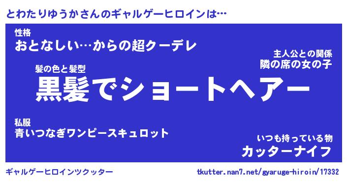 | 男性向けラノベタイトル風あだ名 | 『とわたりゆうかの憂鬱』 |