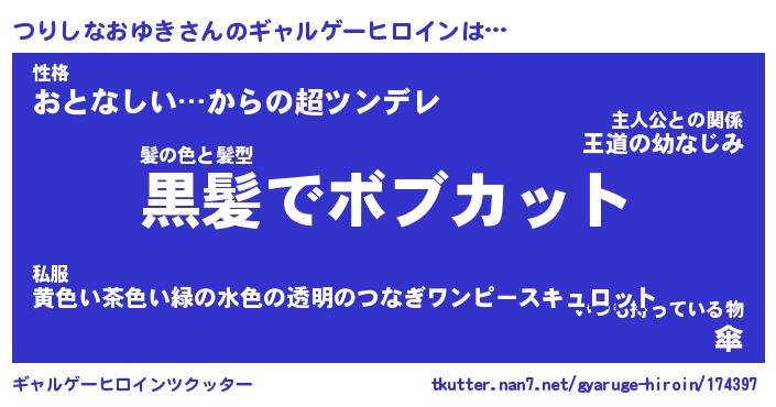 | 女子向けラノベタイトル風あだ名 | 『(仮)つりしなおゆきのやんごとなき事情』 |
