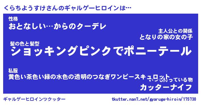 | 女子向けラノベタイトル風あだ名 | 『(仮)くらちようすけのやんごとなき事情』 |