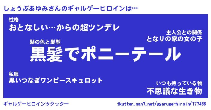 | 男性向けラノベタイトル風あだ名 | 『しょうぶあゆみの憂鬱』 |