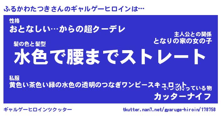 | 女子向けラノベタイトル風あだ名 | 『(仮)ふるかわたつきのやんごとなき事情』 |