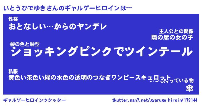 | 女子向けラノベタイトル風あだ名 | 『(仮)いとうひでゆきのやんごとなき事情』 |