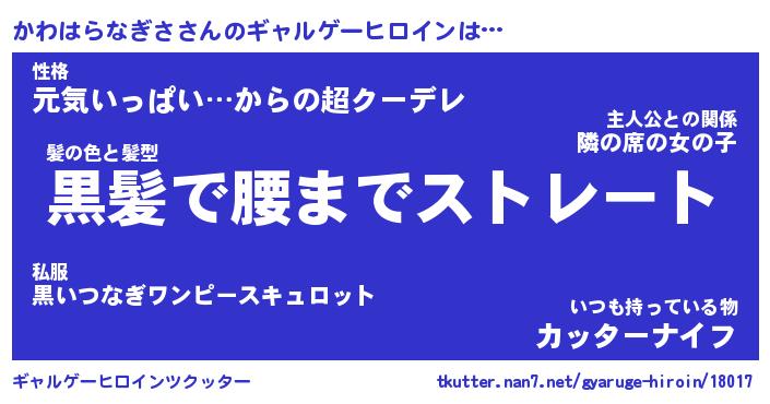 | 男性向けラノベタイトル風あだ名 | 『かわはらなぎさの憂鬱』 |