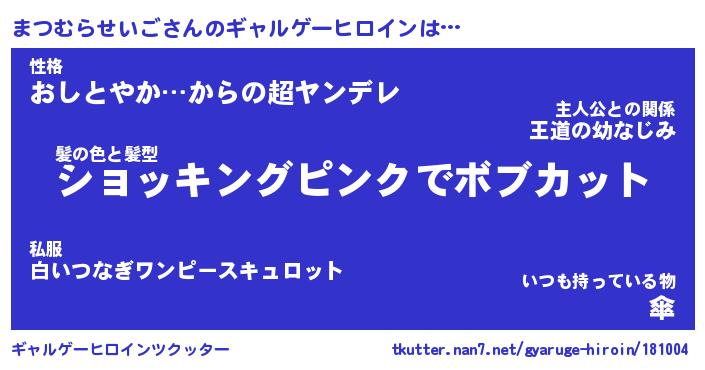 | 女子向けラノベタイトル風あだ名 | 『(仮)まつむらせいごのやんごとなき事情』 |
