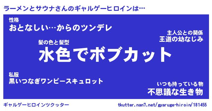 | 女子向けラノベタイトル風あだ名 | 『(仮)ラーメンとサウナのやんごとなき事情』 |
