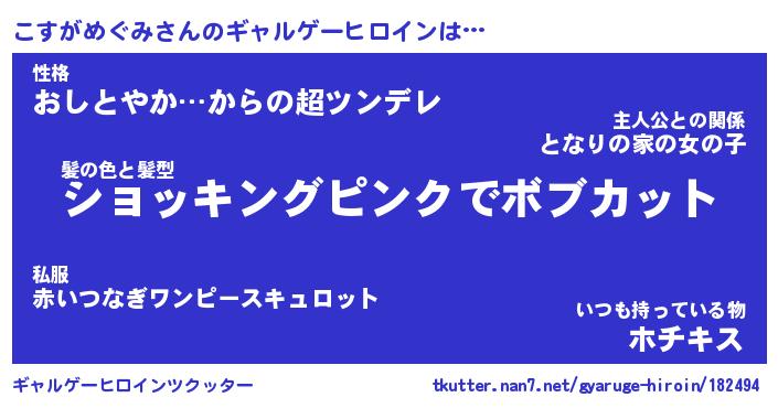 | 女子向けラノベタイトル風あだ名 | 『(仮)こすがめぐみのやんごとなき事情』 |