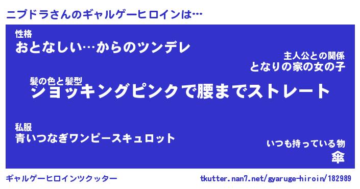 | 女子向けラノベタイトル風あだ名 | 『(仮)ニプドラのやんごとなき事情』 |
