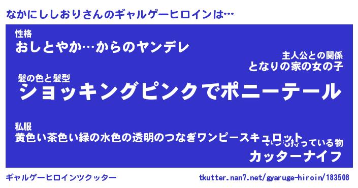 | 女子向けラノベタイトル風あだ名 | 『(仮)なかにししおりのやんごとなき事情』 |