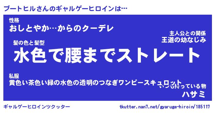 | 女子向けラノベタイトル風あだ名 | 『(仮)ブートヒルのやんごとなき事情』 |