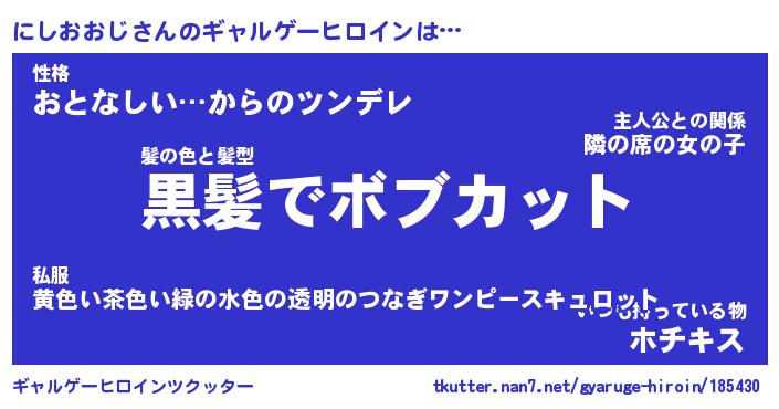 | 女子向けラノベタイトル風あだ名 | 『(仮)にしおおじのやんごとなき事情』 |